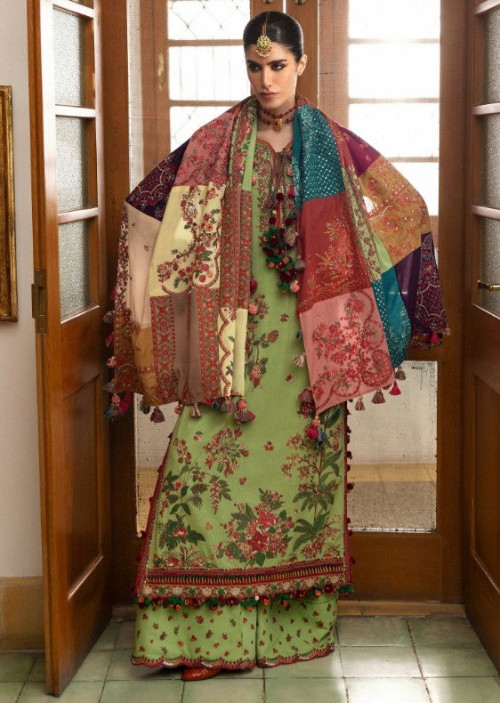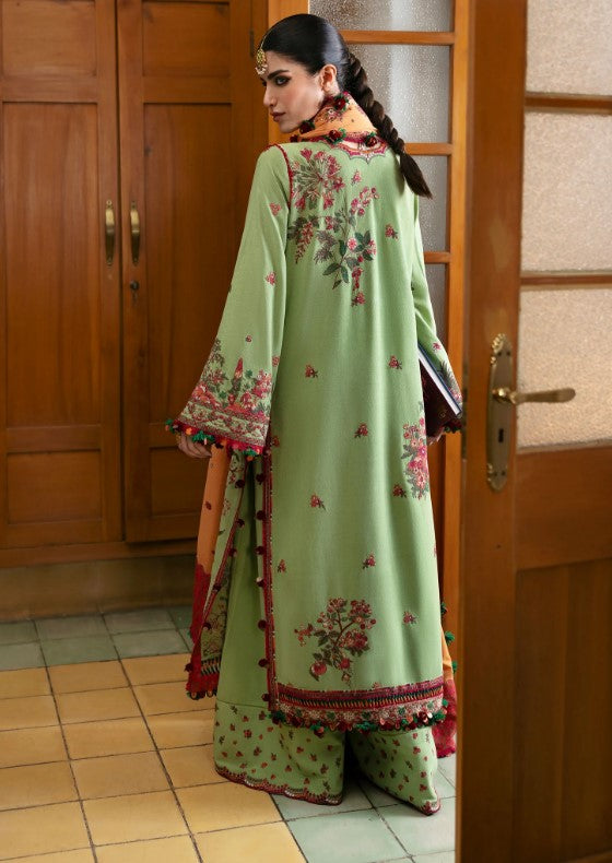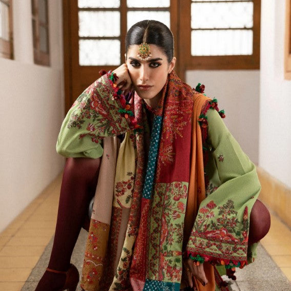 This parrot green karandi ensemble brings together exquisite craftsmanship and timeless charm.The intricate floral embroidery graces every inch,forming a pattern that exudes sophistication.The same-tone embroidered trousers enhance the coordinated feel,while a contrasting karandi shawl adds depth and a stylish edge.with every detail thoughtfully crafted,this outfit is a standout addition to your winter wardrobe-a truly refined choice for the discerning fashion enthusiast.