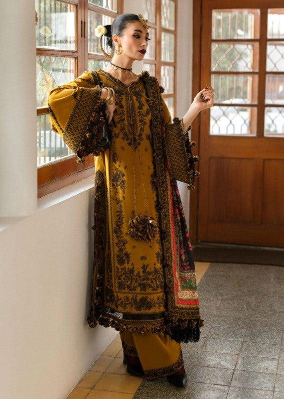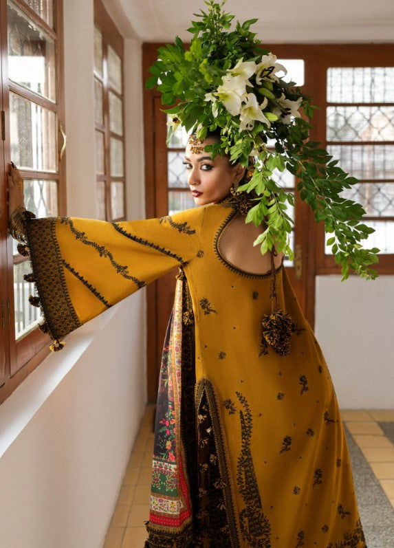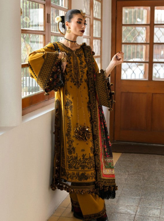 Golden allure meets classic charm in this mustard ensemble, a true embodiment of elegance and sophistication. The intricate embroidery on karandi fabric, paired with a digitally printed wool shawl, creates a captivating look that will leave a lasting impression. From the embroidered dupatta with a four-sided border to the delicately crafted front and back panels, every detail is thoughtfully designed to enhance your natural beauty. The matching trousers and embroidered borders add a perfect finishing touch, making this outfit a timeless choice for those who appreciate artistry in every stitch.